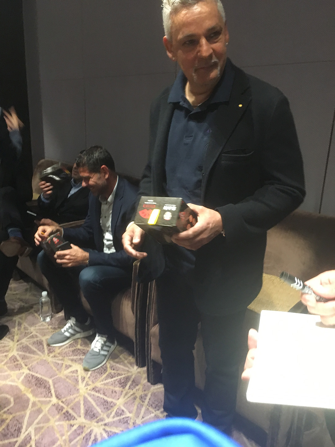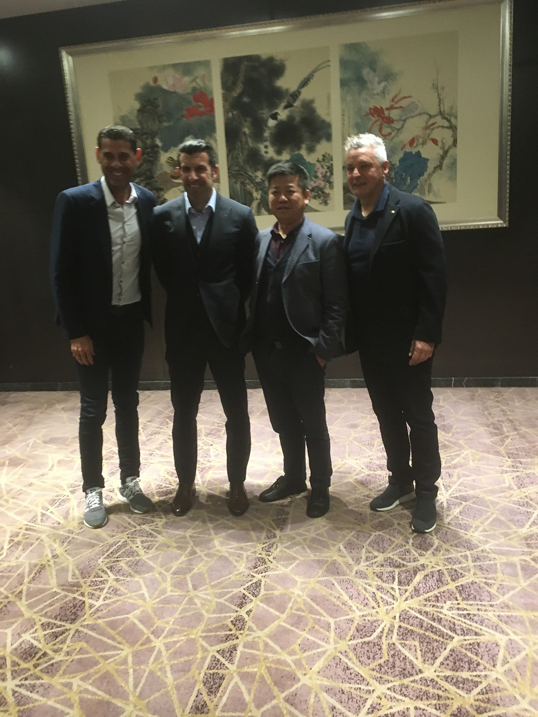 以足球鏈接世界,以情懷共結人心,作為傳奇杯足球全明星中國賽官方贊助商,四川省百世興食品產業有限公司董事長官毅出席晚宴,與巴喬、菲戈、希耶羅等巨星親切合影,并獻上四川特色禮物—川劇變臉玩偶。