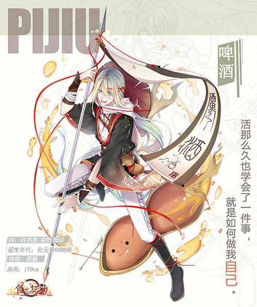 SR饗靈啤酒是《食之契約》限定饗靈中的另類輔助,為啤酒配音的cv是《工作細胞》中的“白細胞”前野智昭,聲線渾厚沉重,角色成熟內斂,完美詮釋了啤酒的灑脫;在戰斗中,啤酒提升全體友方攻擊力、攻擊速度,為戰斗提供了很好的加持,但與此同時,使群體友方沉默3秒,需要注意饗靈搭配,合理利用資源,才能最后的勝利。